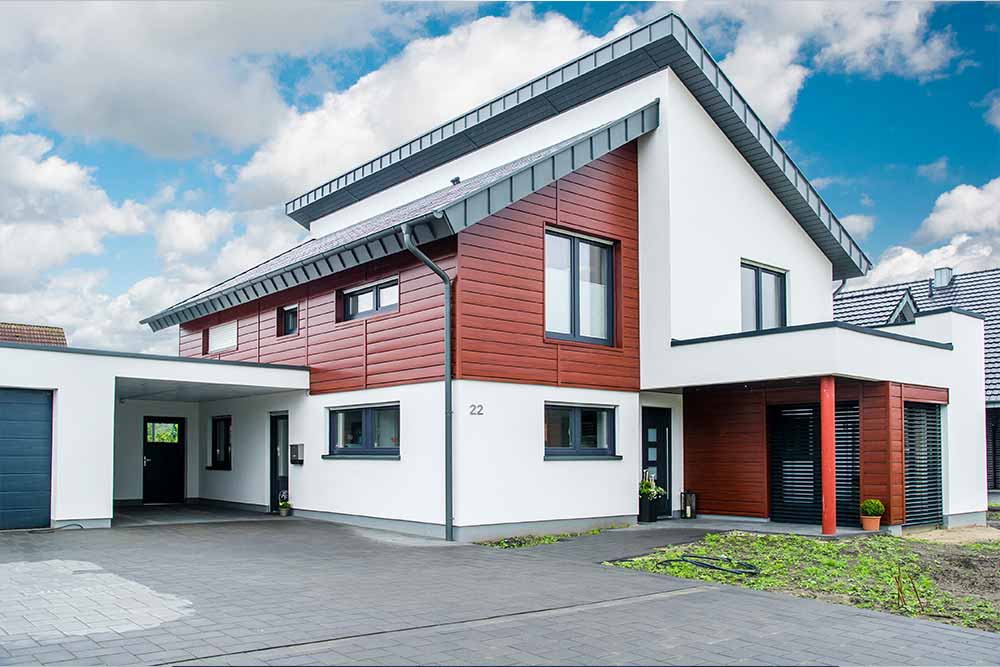 Setzen Sie architektonische Akzente mit metallener Fassadenverkleidung, wie hier Paneele in Holzoptik. Schaffen Sie einen harmonischen Übergang zwischen Dach, Dachentwässerung und Wänden.